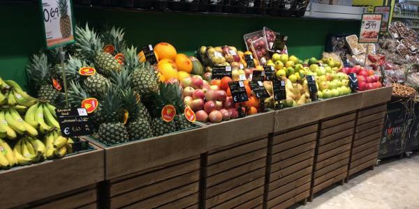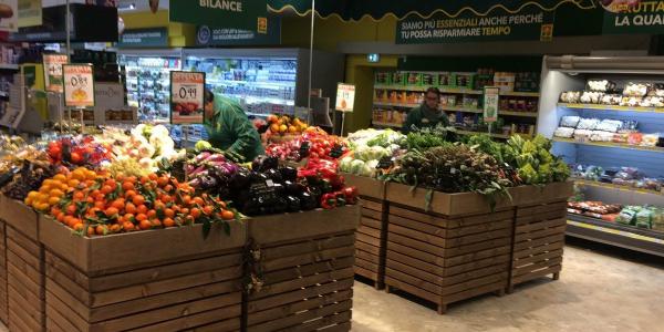 Anche nei due nuovi negozi lo spazio per il reparto ortofrutta è molto curato, un allestimento che fa perno su un design accattivante, gioca con l'effetto legno, e cerca di mettere in risalto la freschezza dei prodotti ortofrutticoli.