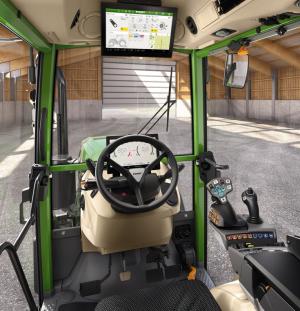 La filosofia di comando FendtONE comprende una nuova consolle laterale con il joystick multifunzione, la leva a croce e il terminale da 12″ integrato nel soffitto del tetto sopra il parabrezza. Non dimentichiamoci della dashboard digitale da 10″ che si trova davanti, nella colonna di sterzo, dove vengono visualizzati, ad esempio, velocità di avanzamento, numero di giri del motore e livelli dei liquidi.