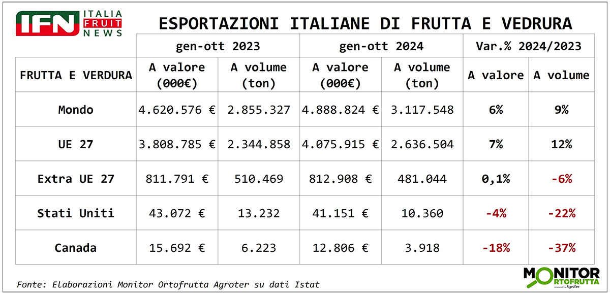 Se passiamo all’ortofrutta, invece, il nostro export con gli Stati Uniti non è così importante, considerando che vale poco più di 20.000 tonnellate (0,6% del totale e 3% dell’extra Ue) ed è in progressiva riduzione anche da prima del ritorno di Trump, come di può evincere dalle tabelle seguenti.