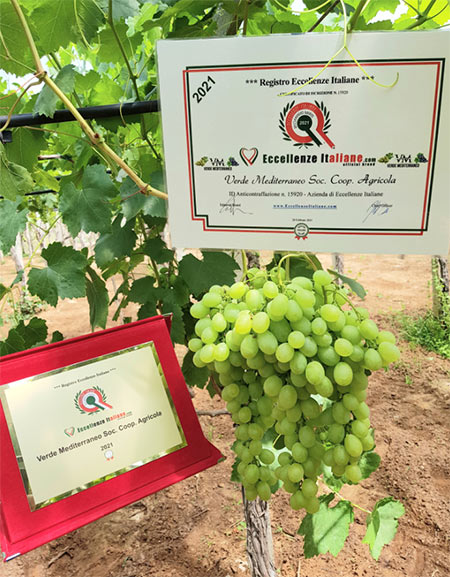 Da quest'anno la cooperativa Verde Mediterraneo è entrata a far parte del registro delle Eccellenze Italiane (www.eccellenzeitaliane.com), portale delle Pmi italiane che lavora per proteggere e diffondere i marchi e la qualità dei prodotti italiani. “Tutte le uve sono di nostra produzione e presentano il bollino Eccellenze Italiane, con l’indicazione del nostro codice identificativo anti-contraffazione”, fa sapere Giudice. Che conclude: “Con questa scelta dimostriamo di sostenere le produzioni Made in Italy e di lavorare garantendo la piena trasparenza e tracciabilità a tutti i nostri clienti e consumatori”.