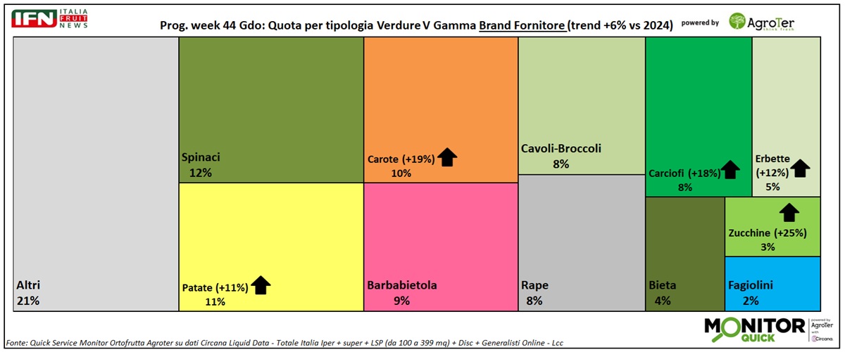 Il mercato della V Gamma continua a correre, confermando una domanda in forte accelerazione sia nella Gdo sia nei Discount. I dati aggiornati alla week 44 del 2025 mostrano una crescita complessiva a valore del comparto V Gamma del +9,2% nella distribuzione moderna, trainata dai Discount che segnano un brillante +13,3%. Anche la MDD contribuisce al dinamismo del settore, registrando incrementi a doppia cifra e ampliando l’offerta con nuove linee dedicate. Spinaci, carote, patate e cavoli-broccoli guidano i trend più robusti. In questo contesto, abbiamo approfondito il tema con un’azienda specializzata come Annatura, grazie alla disamina del responsabile commerciale Giovanni Palermo.