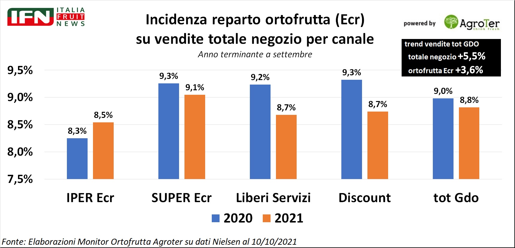 Le vendite complessive della Gdo nel 2021, nei 12 mesi terminanti a settembre, hanno infatti avuto un trend positivo (+5,5% a valore), tuttavia il reparto ortofrutta cresce con minore intensità (+3,6%), con effetti sull’incidenza del reparto: la quota delle vendite di frutta e verdura nel 2021 si attesta ad un 8,8% sul negozio, con una differenza di -0,2 punti percentuali rispetto al 2020 in cui il dato è stato del 9%.