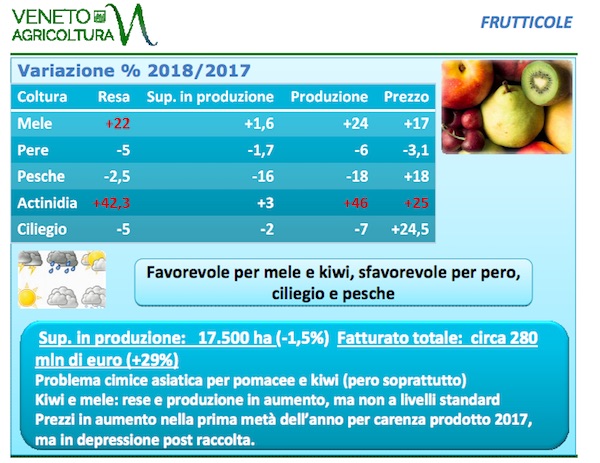 Annata climatica tutto sommato favorevole per le frutticole, con un incremento delle rese e della produzione di mele (291.000 tonnellate, +24%) e kiwi (57.400, +46%) anche se al di sotto dei livelli medi per le due colture. Prezzi in progresso in entrambi i casi. Le condizioni meteo hanno creato seri problemi fitosanitari a ciliegie, pesche-nettarine e pere (queste ultime particolarmente colpite dalla cimice asiatica), causando cali consistenti di rese e produzione. A parità di superficie, la resa del pero è scesa del 5% e la produzione del 6%, mentre le pesche-nettarine hanno visto ulteriormente ridursi la superficie dedicata (-16%), con conseguente flessione della produzione (-18%). In aumento la superficie dedicata al melone (+3% per 1.160 ettari), con prezzi medi in calo del 24% nel Veronese. In calo del 23% la superficie investita a fragole ma tutto sommato buono l’andamento commerciale, con un balzo del 18% dei prezzi medi.