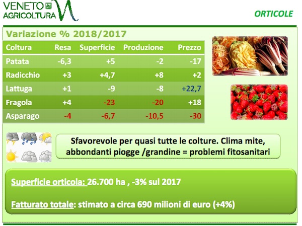 Le superfici investite a orticole sono scese a circa 26.700 ettari, in calo del 3% rispetto al 2017. Quelle in piena aria - il 75% degli ortaggi coltivati in regione - dovrebbero attestarsi sui 23.500 ettari (-4%), mentre gli spazi in serra, stimati in circa 3.850 ettari, si riducono del 2,8%; in aumento le piante da tubero (3.270 ettari, +5%). L’andamento climatico ha favorito l’insorgere di problemi fitosanitari per le principali colture con rese negative e diminuzione della produzione per patate (127.400 tonnellate, -2%) e lattughe (-8%); in aumento la produzione di radicchio (134.400 tonnellate, +8%) in virtù di un incremento della superficie (+4,7%) e delle rese (+3%).