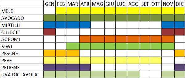 Per fugare ogni (lecito) dubbio sulla stagionalità dei prodotti cileni e facilitare la comprensione di tutte le informazioni a riguardo, è giusto ricordare che il Cile, essendo nell'emisfero sud, produce ed esporta in contro-stagione rispetto a noi ed ai suoi principali mercati di destinazione. Ecco un rapido specchietto delle principali produzioni: