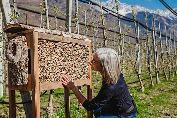 Cassette nido e ausili di nidificazione per insetti e uccelli: molti uccelli canori utili nidificano in cavità. Il 67% delle aziende agricole intervistate in Val Venosta offre agli uccelli cassette nido idonee per allevare la nidiata, mentre il 47% delle aziende agricole ha costruito cassette per api come ausili di nidificazione per insetti volanti.