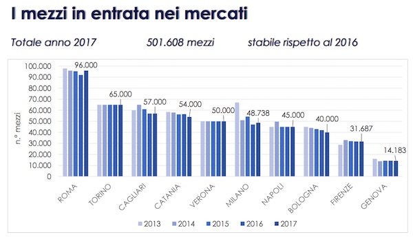 Spicca il numero elevato di mezzi in ingresso nei due Centri agroalimentari isolani (Catania e Cagliari) mentre al Mercato di Genova l'accesso è rimasto limitato a 14mila veicoli. In totale erano 1.262 gli operatori attivi e poco più di mezzo milione i mezzi entrati nei dieci Mercati lo scorso anno, in linea - per entrambe le voci - con il dato 2016.