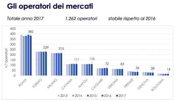 Roma è in vetta anche nel numero di imprese che operano in Mercato (382) e nei mezzi in entrata (96mila), due voci che evidenziano alcune indicazioni significative rispetto alla classifica dei volumi; Milano, ad esempio, contava lo scorso anno 215 operatori a fronte dei 63 di Verona, che pure la supera per quantitativi movimentati, mentre Firenze, Genova e Bologna, rispettivamente con 36, 28 e 16 aziende, sono le città i cui Mercati all’ingrosso contano meno imprese grossiste.