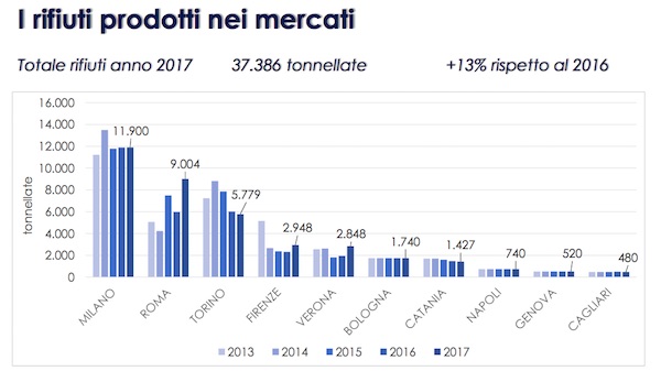 L’Annuario 2018 riporta poi la tabella dei rifiuti prodotti nei Mercati (prima Milano, seconda Roma, terza Torino: nella tabella sopra il dettaglio) e dei prodotti recuperati e inviati a organizzazioni benefiche, aumentati del 4,5% tanto da raggiungere quota 3.386 tonnellate: in questa classifica spicca Milano con 1.500 tonnellate, quasi il triplo di Roma, seconda con 650 tonnellate. Alle loro spalle Catania (440) e Torino (430), quinta Bologna (261).