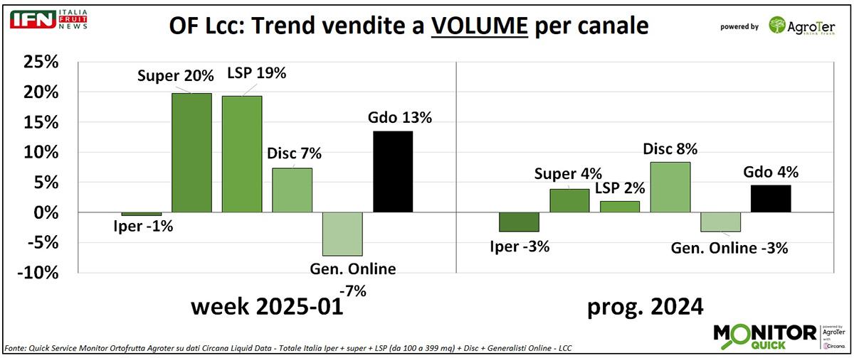 Tra i diversi canali di vendita, l'ortofrutta Lcc registra risultati generalmente positivi in quelli fisici, mentre l’online è sempre in flessione, con performance particolarmente rilevanti a volume nei supermercati (+20%) e nel libero servizio (+19%). Tuttavia, considerando l'intero 2024, il discount si distingue come il canale con la crescita più significativa (+10% a valore e +8% a volume).