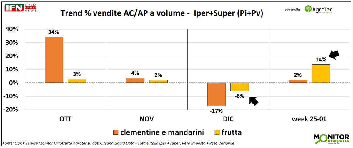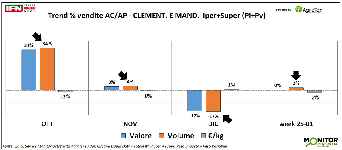Nella fase iniziale della campagna, i volumi registrati negli ipermercati e supermercati hanno mostrato trend generalmente positivi: a ottobre, le vendite sono cresciute a doppia cifra, grazie a un brusco calo delle temperature che ha favorito il consumo di frutta tipica della stagione autunno-invernale. A novembre, pur in un contesto di vendite complessivamente rallentate nel reparto, i volumi hanno segnato un +4%. Tuttavia, il mese di dicembre ha visto un netto calo delle vendite di clementine e mandarini (-17%), con una leggera ripresa nella prima settimana di gennaio (+2%).