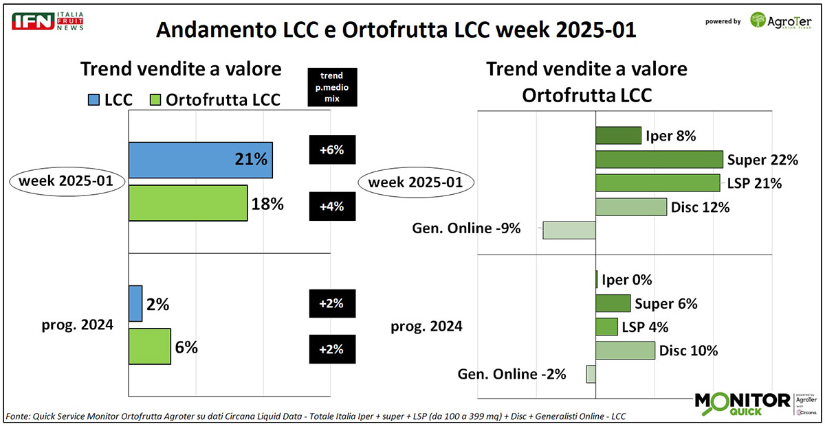 La prima settimana del 2025 mostra trend di forte crescita sia per il Largo consumo confezionato (LCC, +21% a valore) sia per l'ortofrutta Lcc (+18%), accompagnati da una ripresa del prezzo medio mix per quest'ultima (+4 punti).