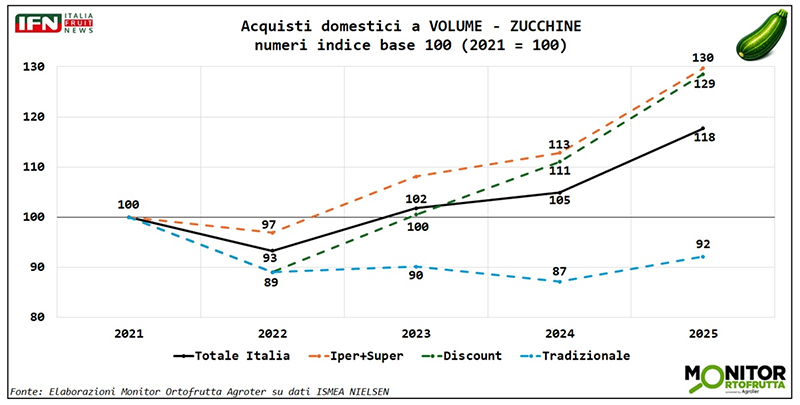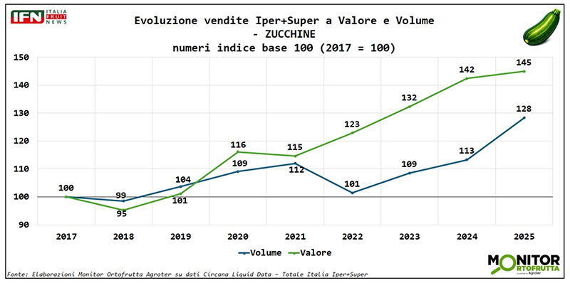 Nelle ultime settimane la zucchina è tornata al centro di tensioni sui prezzi, complice un meteo instabile che ha ridotto le disponibilità: una fragilità “strutturale” per un ortaggio molto sensibile agli sbalzi termici. Ma se si allarga lo sguardo al medio periodo emergono segnali incoraggianti. Le analisi del Monitor Ortofrutta di Agroter mostrano infatti volumi in crescita, soprattutto in Gdo, nonostante gli anni di inflazione. Il consumatore resta attentissimo al prezzo – e lo dimostra la reattività dei quantitativi appena le quotazioni rientrano anche di poco – ma proprio per questo la partita si gioca sulla valorizzazione a scaffale: costruire segmentazione e proposta significa ridurre i “saliscendi” e dare più stabilità alla categoria.