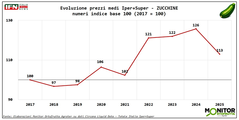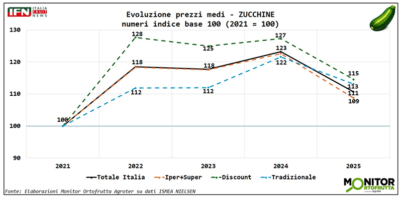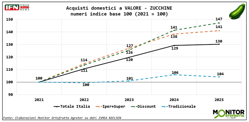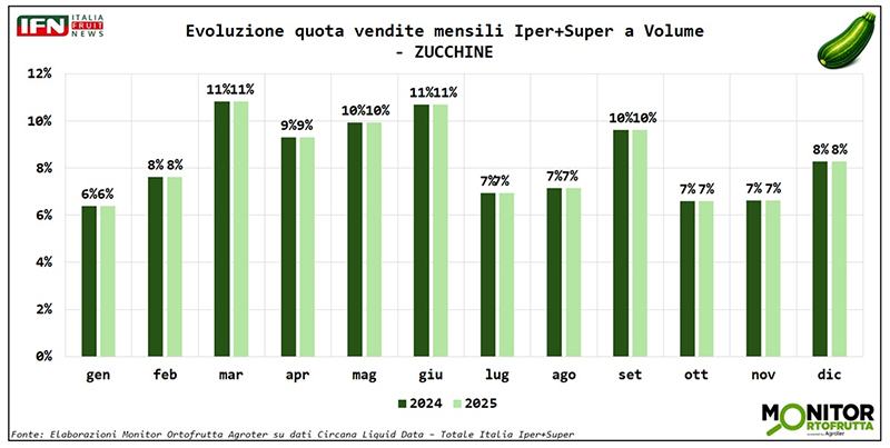 Da queste ultime considerazioni si può trarre un messaggio importante: la zucchina non è solo “prodotto da prezzo”, ma una referenza che — se gestita bene a scaffale — riesce a crescere anche in fatturato, nonostante il rientro delle tensioni sul prezzo medio.