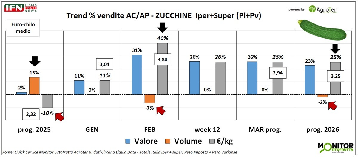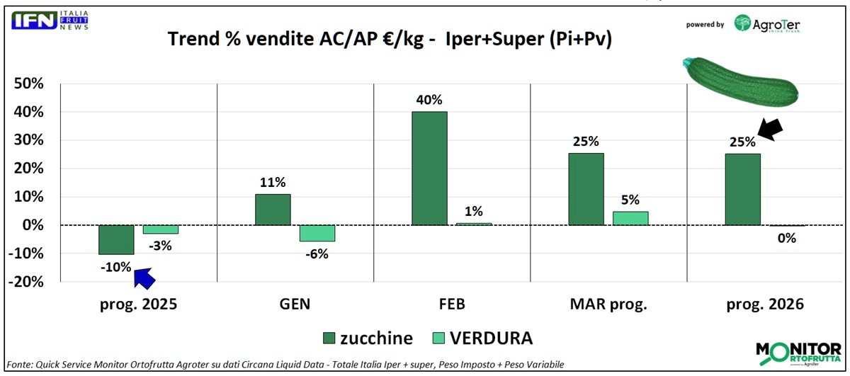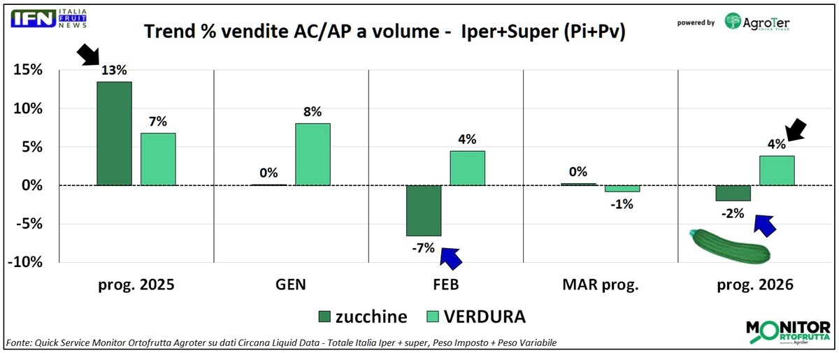 Sul fronte dei consumi, le zucchine mostrano un andamento diverso rispetto alla verdura nel suo complesso. Nel 2025, in un contesto generale di crescita, l’ortaggio aveva registrato una performance nettamente migliore rispetto alla media del comparto: +13% contro +7%. Nel progressivo del 2026 la verdura mantiene invece un andamento positivo (+4%), con una lieve flessione solo a marzo (-1%). Le zucchine si muovono invece in controtendenza: restano stabili a gennaio e marzo, ma accusano un netto calo a febbraio (-7%), che pesa sul risultato complessivo del periodo.